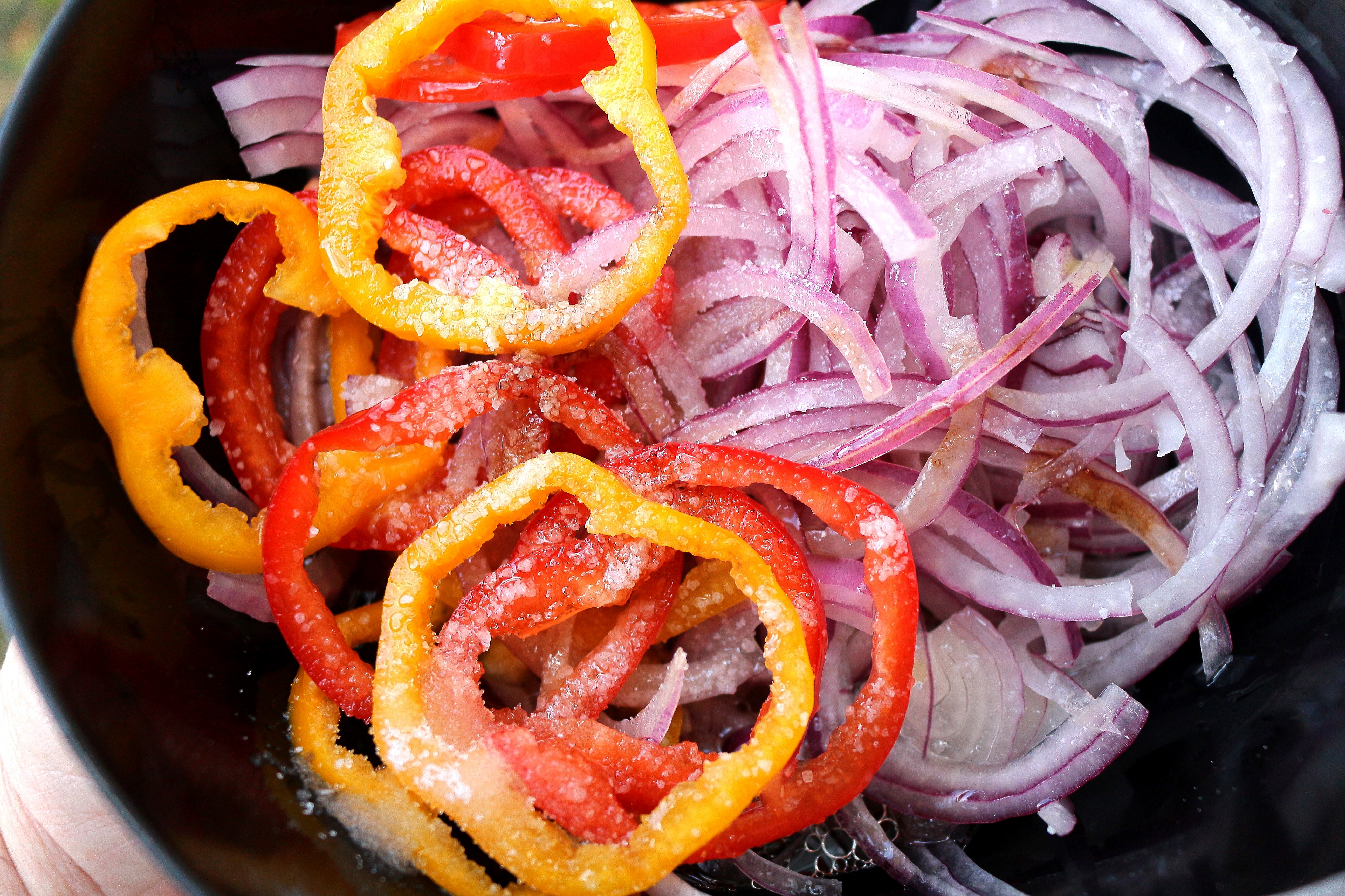 Haricots Verts En Salade ← Previous Next → cut 1/2 ea red pepper, 1/2 ea yellow pepper and 1 ea red onion into julienne/rings