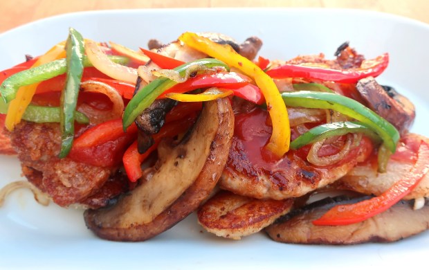 - add 2 tblsp of tomato sauce to each medallion, top with the sauteed veggies