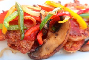 - saute 1/4 red/green/ and red pepper julienne together with 1/2 medium sliced onion and 6 ea small crimini in 1 tblsp EVO, season with kosher salt and cayenne pepper to taste