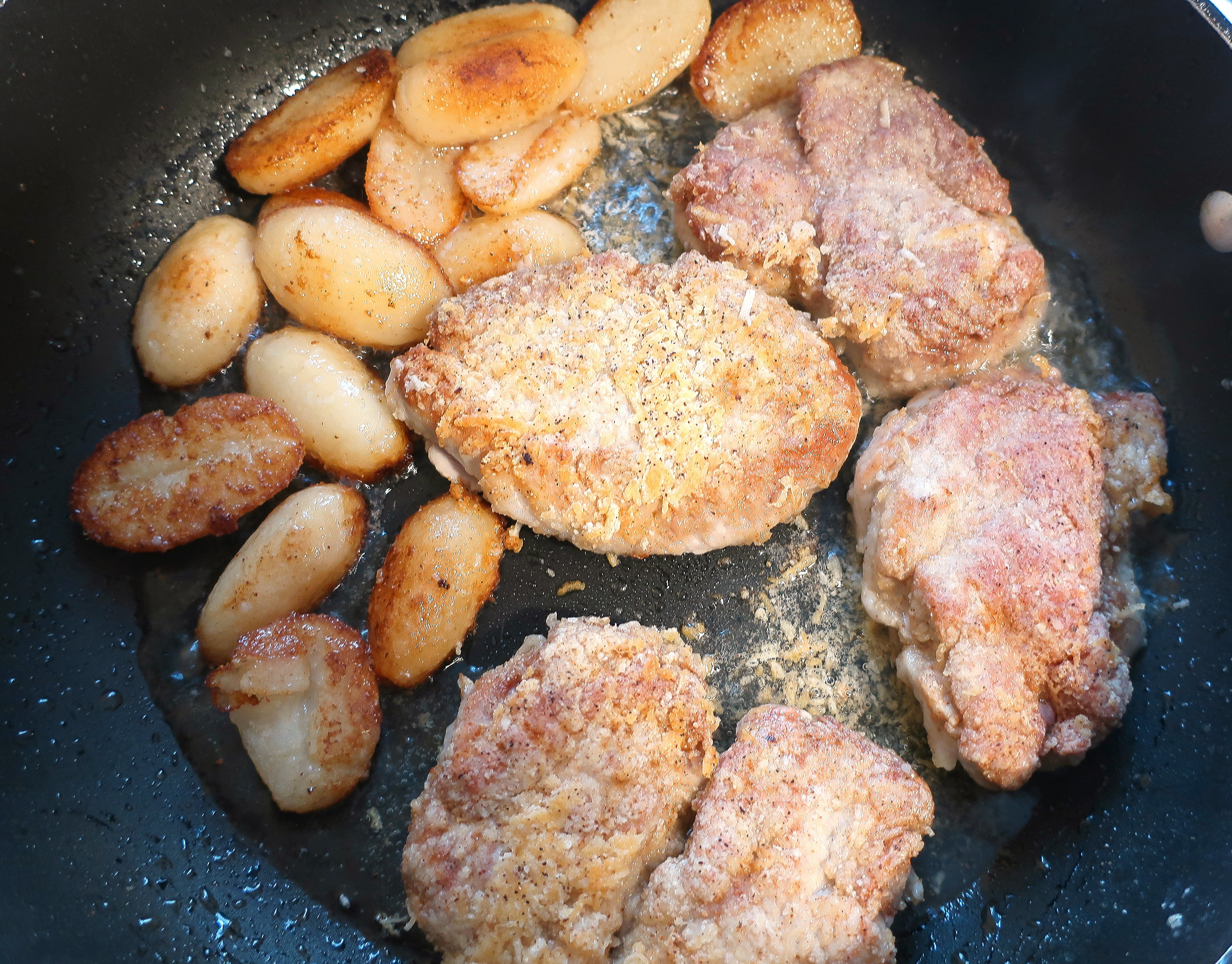 Parmesan Crusted Sauteed Pork Médaillons, With Potatoes, Bell Peppers And Crimini ← Previous Next → saute the medaillons together with 16 ea small, blanched potatoes in EVO until the pork is cooked to your liking and the potatoes are golden and crisp