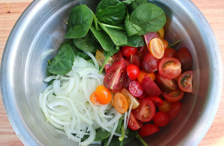 Salad Days Are Here Again………. Next → 2 cup spinach, 1/2 cup onion julienne, 2 cup halved grape tomatoes; dress with 1/2 cup raspberry vinaigrette