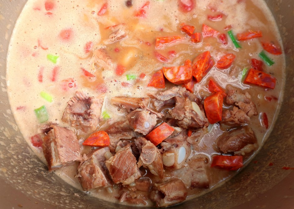 Pork & Beans ← Previous Next → add the pork and sausages, simmer another 3 minutes, check/adjust seasoning