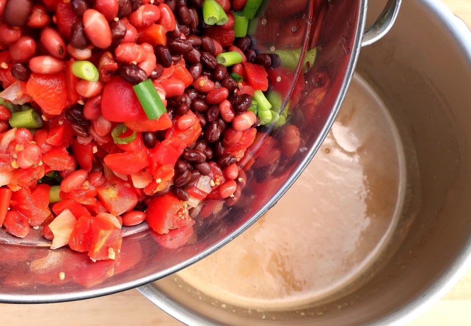 Pork & Beans ← Previous Next → add 1 can each rinsed, drained diced tomatoes, 1 ea black beans, one ea white beans, 1 ea red kidney beans and 3 ea sliced scallions