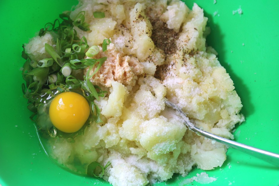 9 ← Previous Next → add 1 ea whole egg, 4 ea finely sliced scallions, 1 tblsp grated horseradish, 2 ea tblsp EVO, 1/2 tsp dried majoram (optional), kosher salt to taste