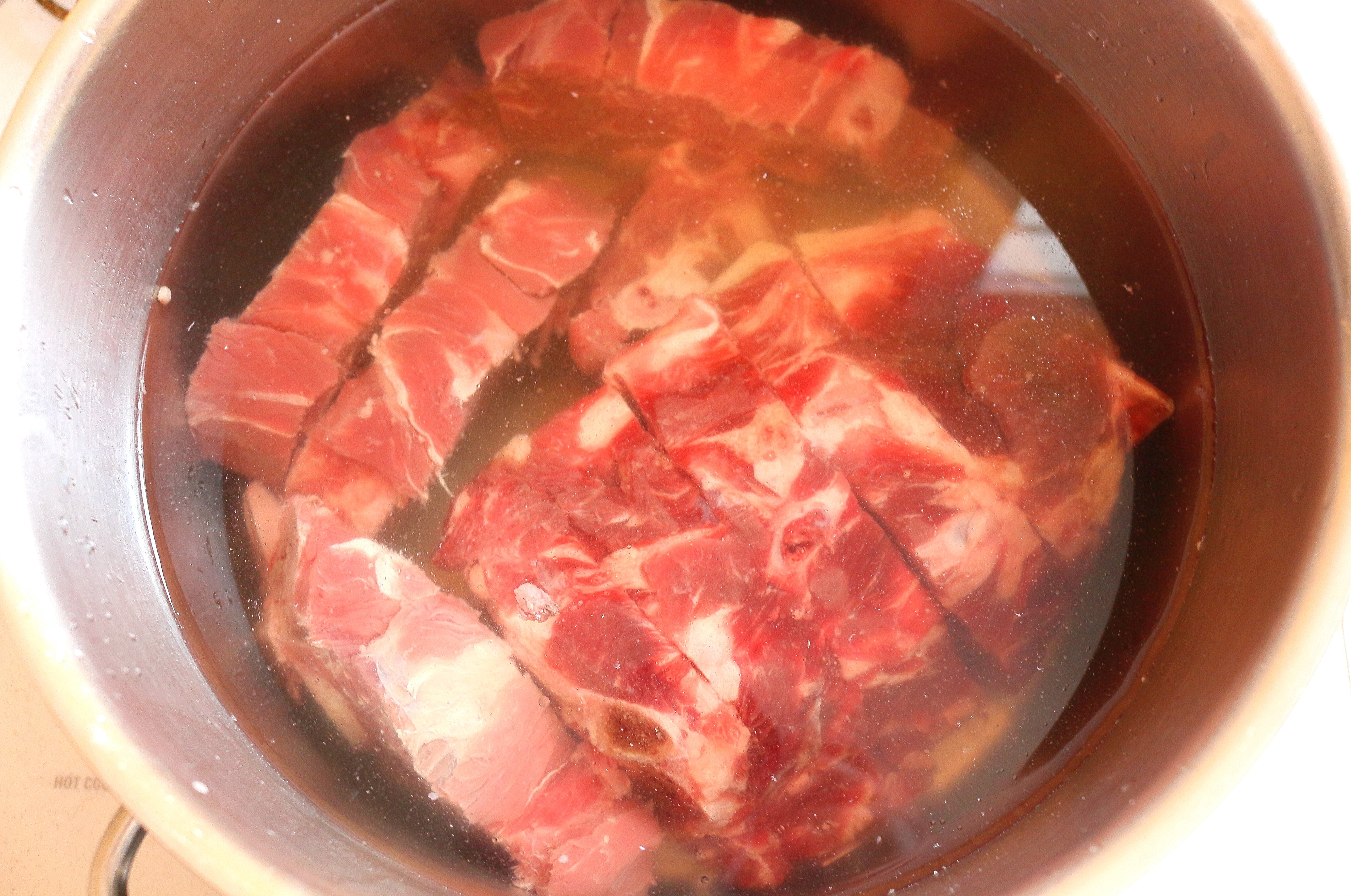simmer 3 lbs of beef neck in 4 qt of lightly salted water