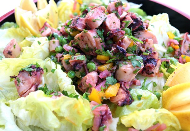 - make a dressing with lemon vinaigrette, green peas, chopped cilantro, red onions and chopped yellow bell peppers, add the cooked octopus, mix well
