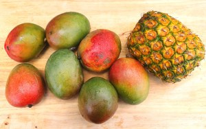 - peel and core pineapple, peel and pit mangoes, cut all into bitesize pieces