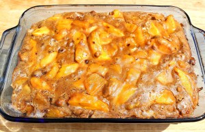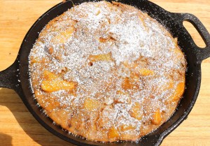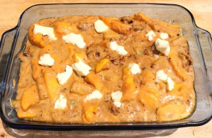 - fill into two pre-heated baking dishes (this tempered glass dish holds the same quantity as the cast iron pan I used), top with butter flakes, bake in a preheated 395 F oven until cooked through, about one hour (depending on the moistness of the fruit); (the cake will feel solid to the touch after 30 minutes, but will still be raw in the center. To check for doneness, best cut a line in the center and carefully lift a bit to see if the center is cooked)