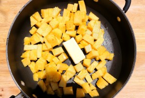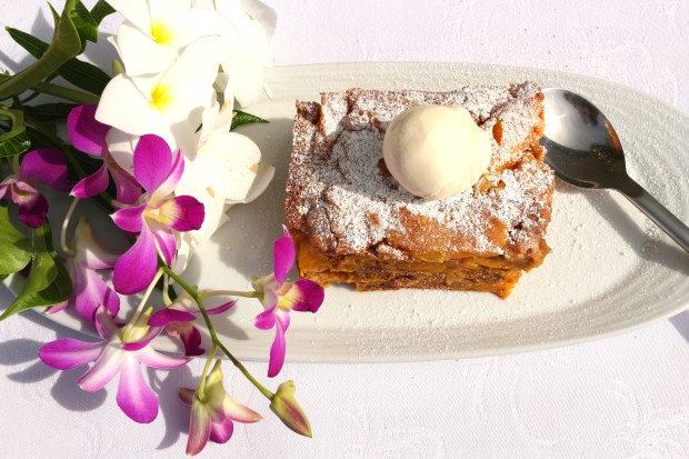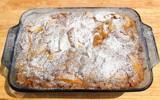 - top with butter flakes, bake in a preheated 395 F oven until cooked through, about one hour (the cake will feel solid to the touch after 30 minutes, but will still be raw in the center. To check for doneness, best cut a line in the center and carefully lift a bit to see if the center is cooked)
