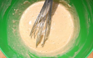 - mix 2 cups of self-rising flour with 10 ea medium size eggs, 1 tblsp vanilla extract and 3/4 cup of sugar and enough milk to make a pancake-like batter