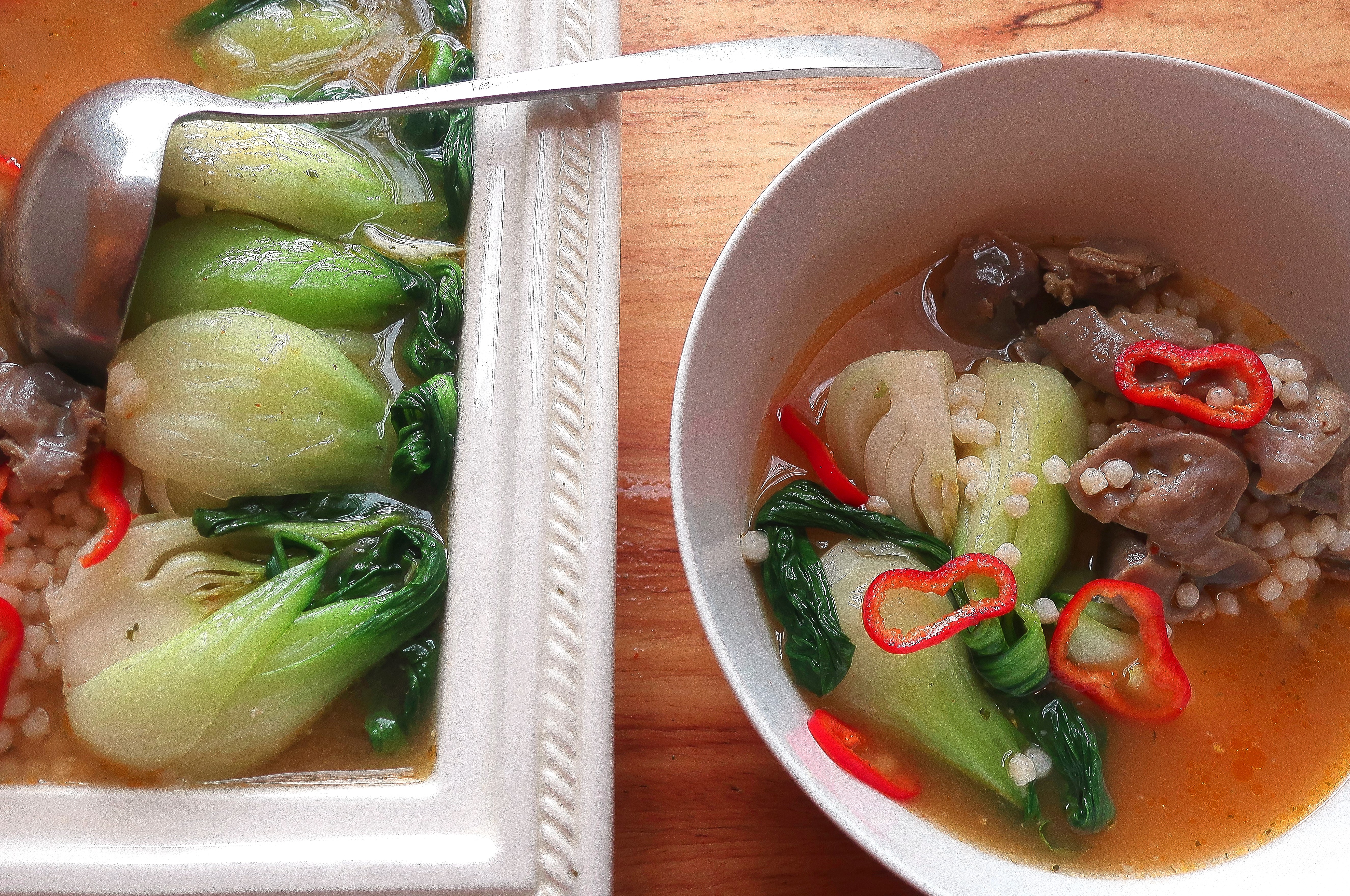 Pasta Pearls, Bok Choy, Mollejas And Chillies In GingerTamarind Broth ← Previous Next → Pasta Pearls, Bok Choy, Mollejas And Chillies In Ginger/Tamarind Broth