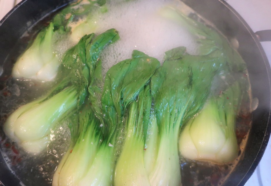 Pasta Pearls, Bok Choy, Mollejas And Chillies In GingerTamarind Broth ← Previous Next → simmer for 30 seconds more, drain and discard the water, place bok choy into ice water