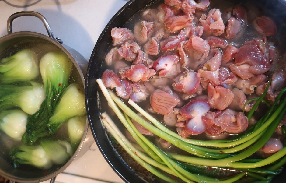 in 2 qt of chicken stock, 1 tsp garlic paste, 1/2 tsp grated ginger, 1/2 tblsp sugar and 5 to 10 scallions (depending on the size), seasoned lightly with kosher salt and chili flakes,simmer 2 lbs mollejas until tender but still with a slight bite, ca 2 hours (some mollejas are tougher than others), remove and discard the scallions, (there should be about 1 qt remaining, otherwise adjust by reducing or adding more stock), season soup with 1 tblsp toasted sesame oil and chili oil to taste