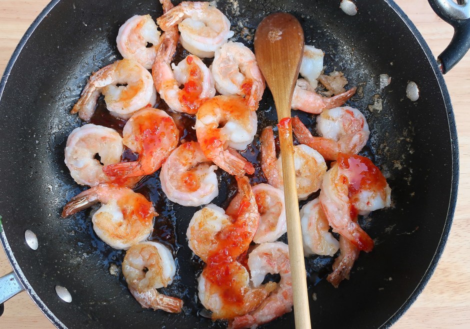 Shrimp & Spinach ← Previous Next → add 1 /2 cup Thai sweet chili sauce and 2 tblsp fresh-squeezed lemon, cook another few seconds, remove from heat, check/adjust seasoning; serves 4 appetizer or 2 generous main courses