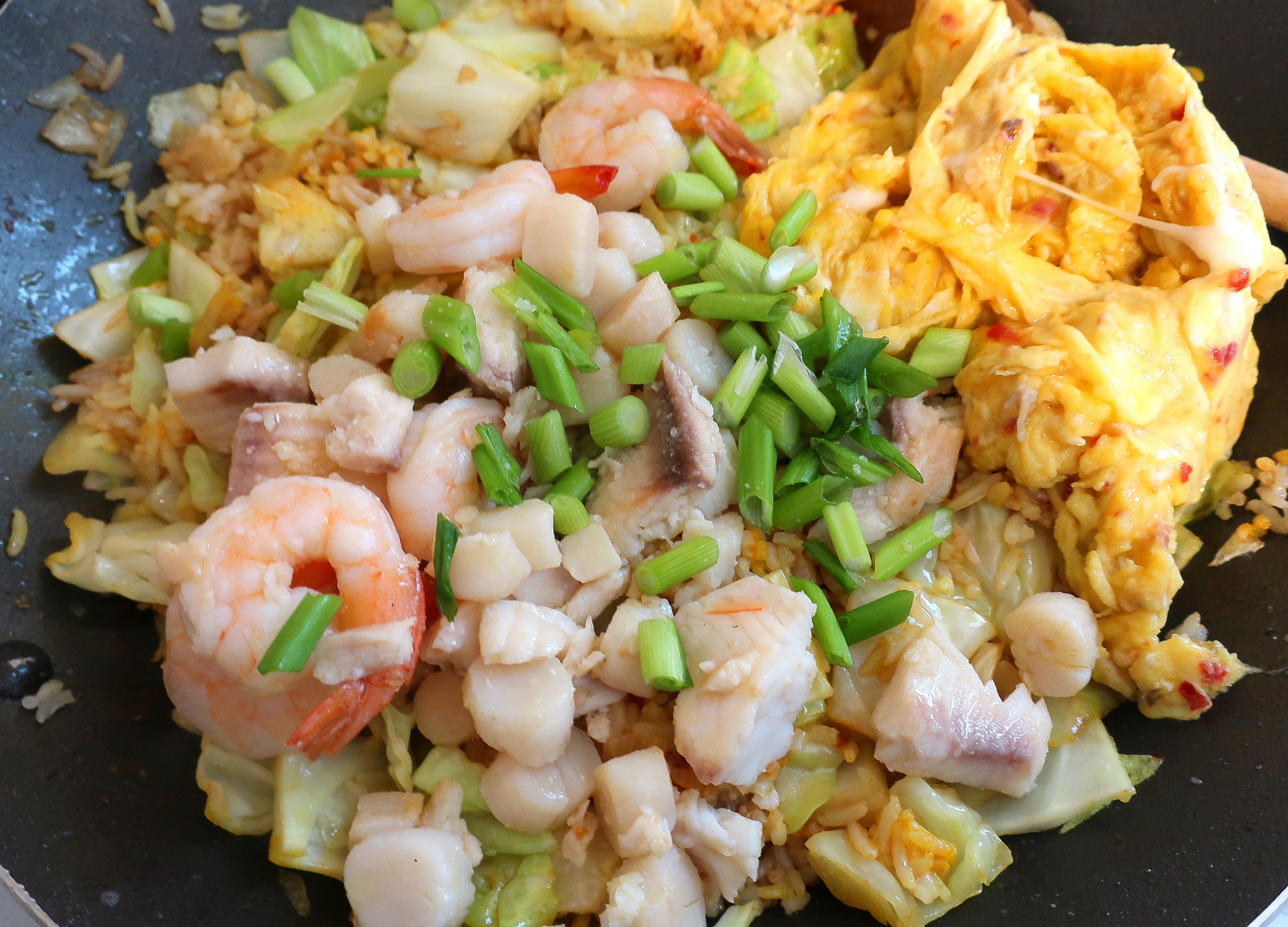 Seafood Fried Rice ← Previous Next → add the seafood, scallions and the eggs, stir fry another minute