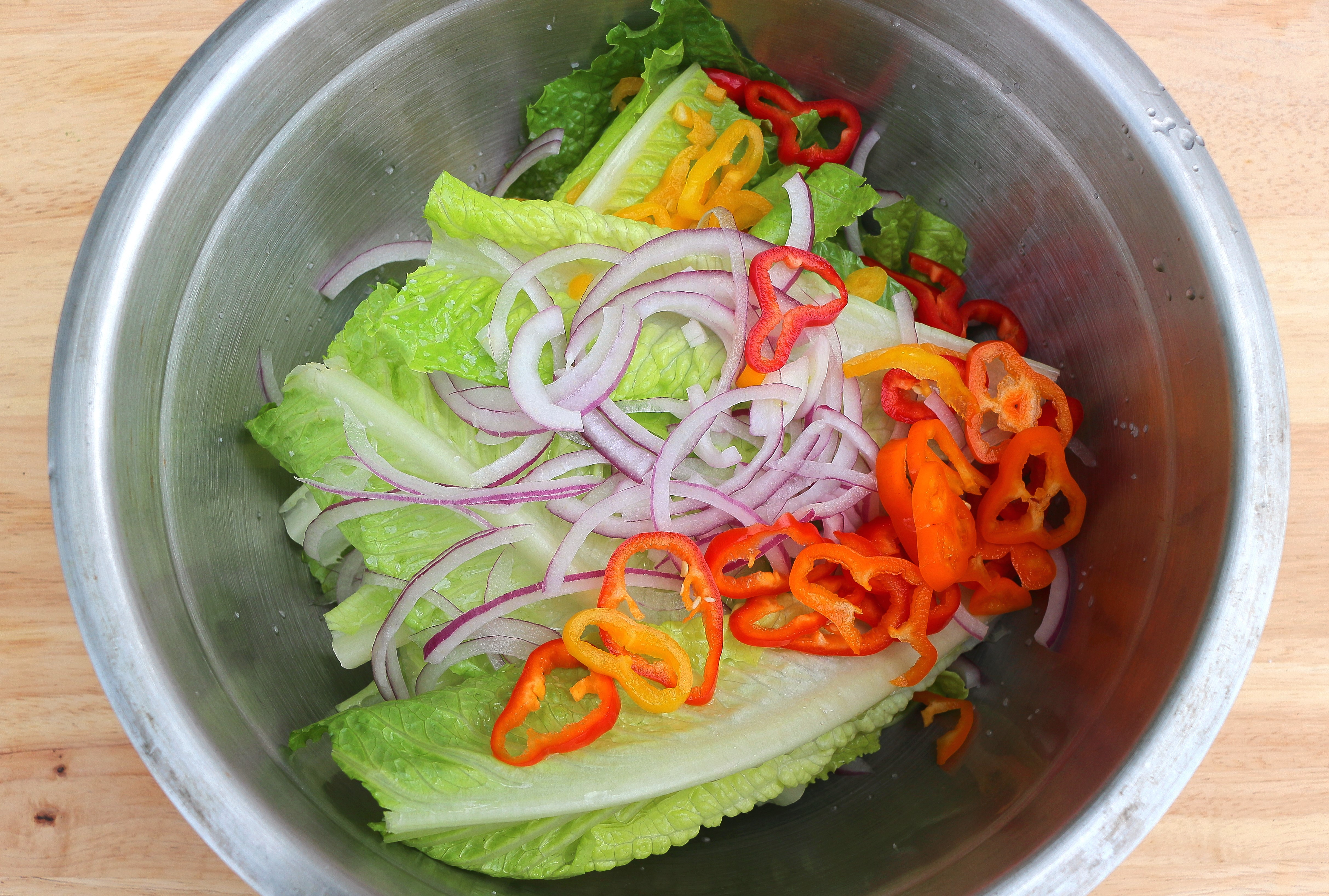 Salad Of Cracked Pepper-Dusted Chicken Liver Nuggets, Shredded Parmigiano Reggiano, Romaine, Mild Chillies And Red Onions Next → dress romaine leaves, sliced mild chilies and red onion julienne in a vinaigrette of your choice