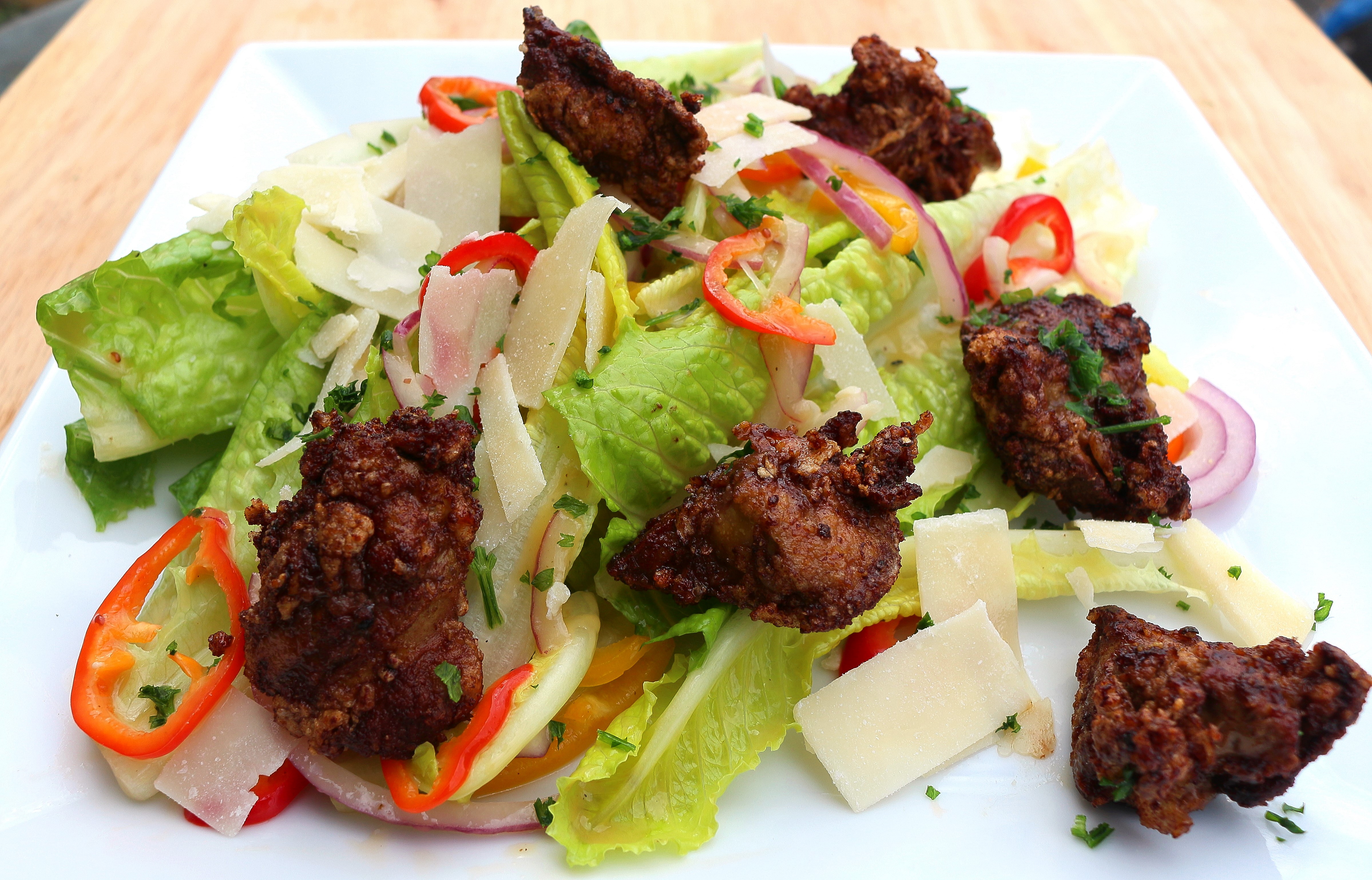 13 ← Previous Next → Salad Of Cracked Pepper-Dusted Chicken Liver Nuggets, Shredded Parmigiano Reggiano, Romaine, Mild Chillies And Red Onions