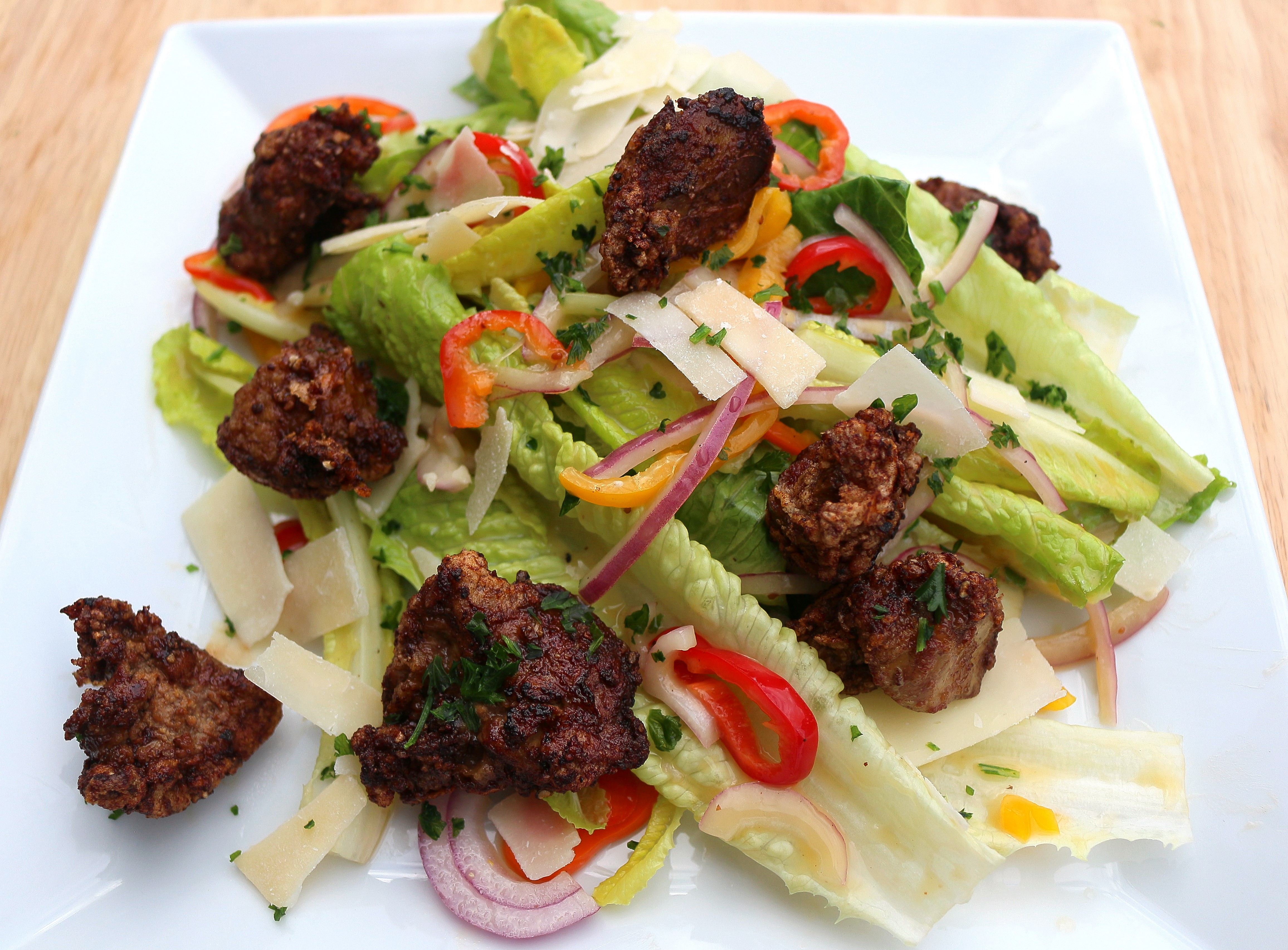 16 ← Previous Next → Salad Of Cracked Pepper-Dusted Chicken Liver Nuggets, Shredded Parmigiano Reggiano, Romaine, Mild Chillies And Red Onions
