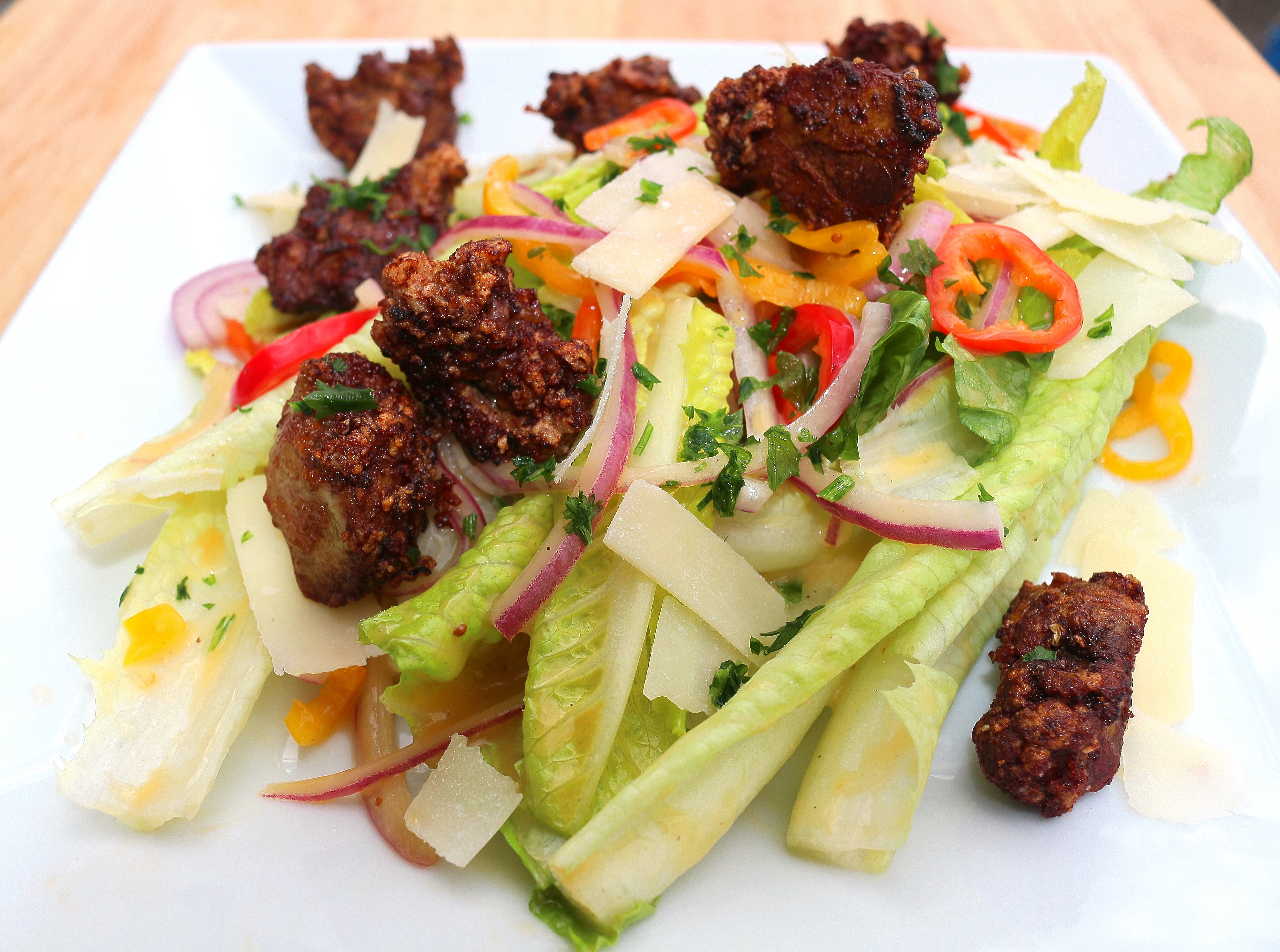 17 ← Previous Salad Of Cracked Pepper-Dusted Chicken Liver Nuggets, Shredded Parmigiano Reggiano, Romaine, Mild Chillies And Red Onions