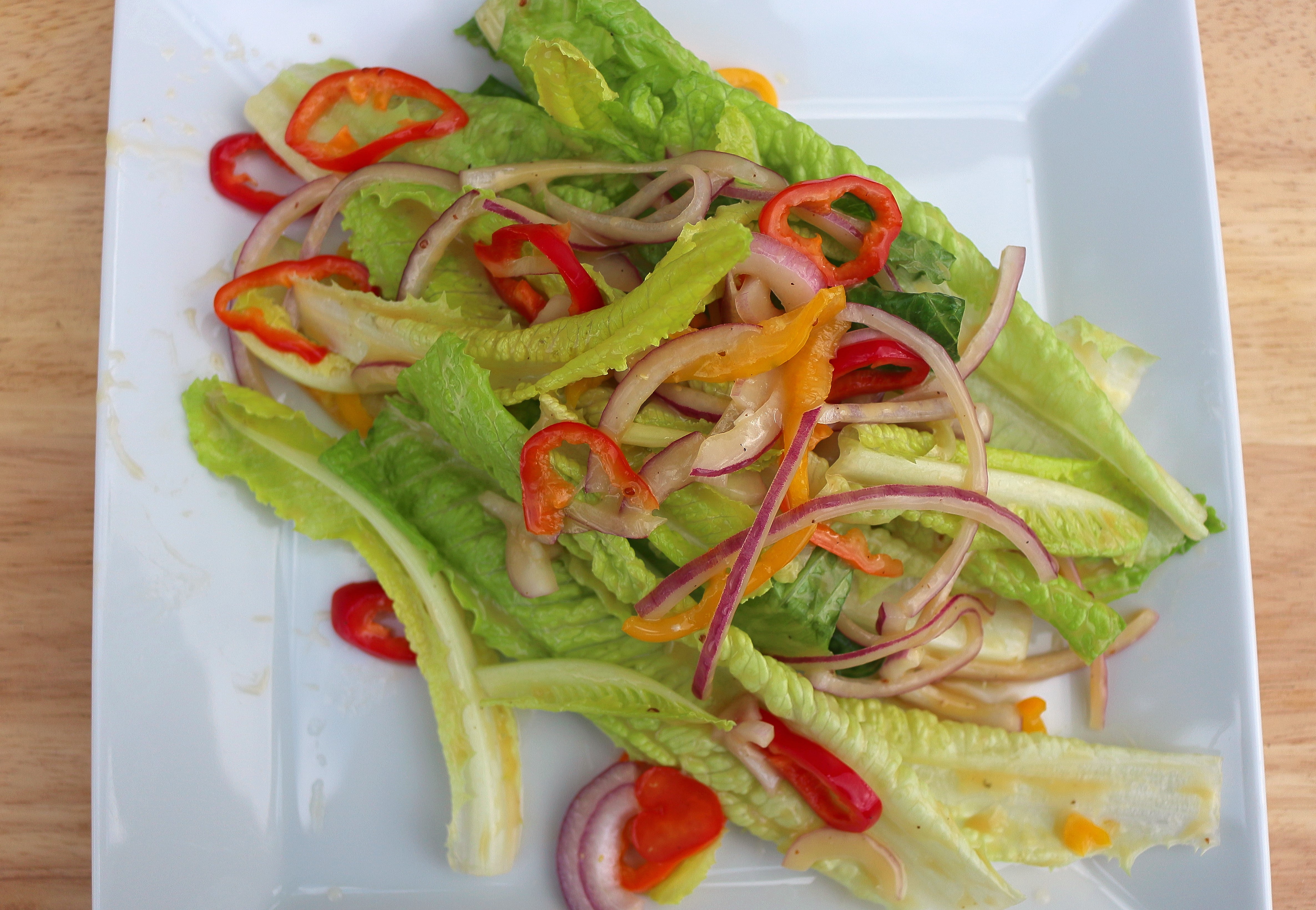 Salad Of Cracked Pepper-Dusted Chicken Liver Nuggets, Shredded Parmigiano Reggiano, Romaine, Mild Chillies And Red Onions ← Previous Next → plate the salad