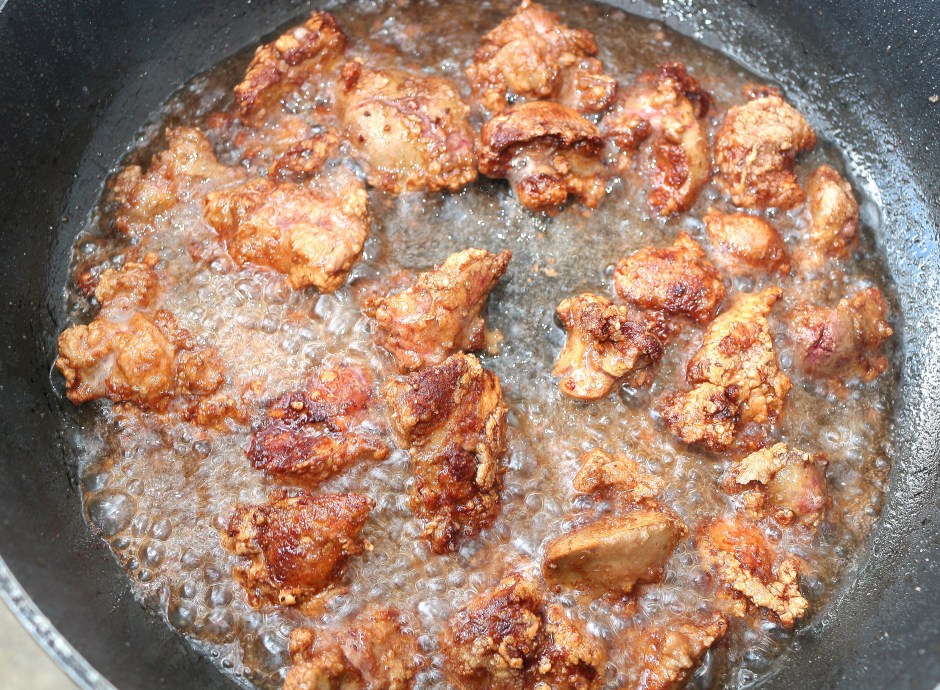 Salad Of Cracked Pepper-Dusted Chicken Liver Nuggets, Shredded Parmigiano Reggiano, Romaine, Mild Chillies And Red Onions ← Previous Next → sautee in 375F peanut oil until crisp but still medium rare inside