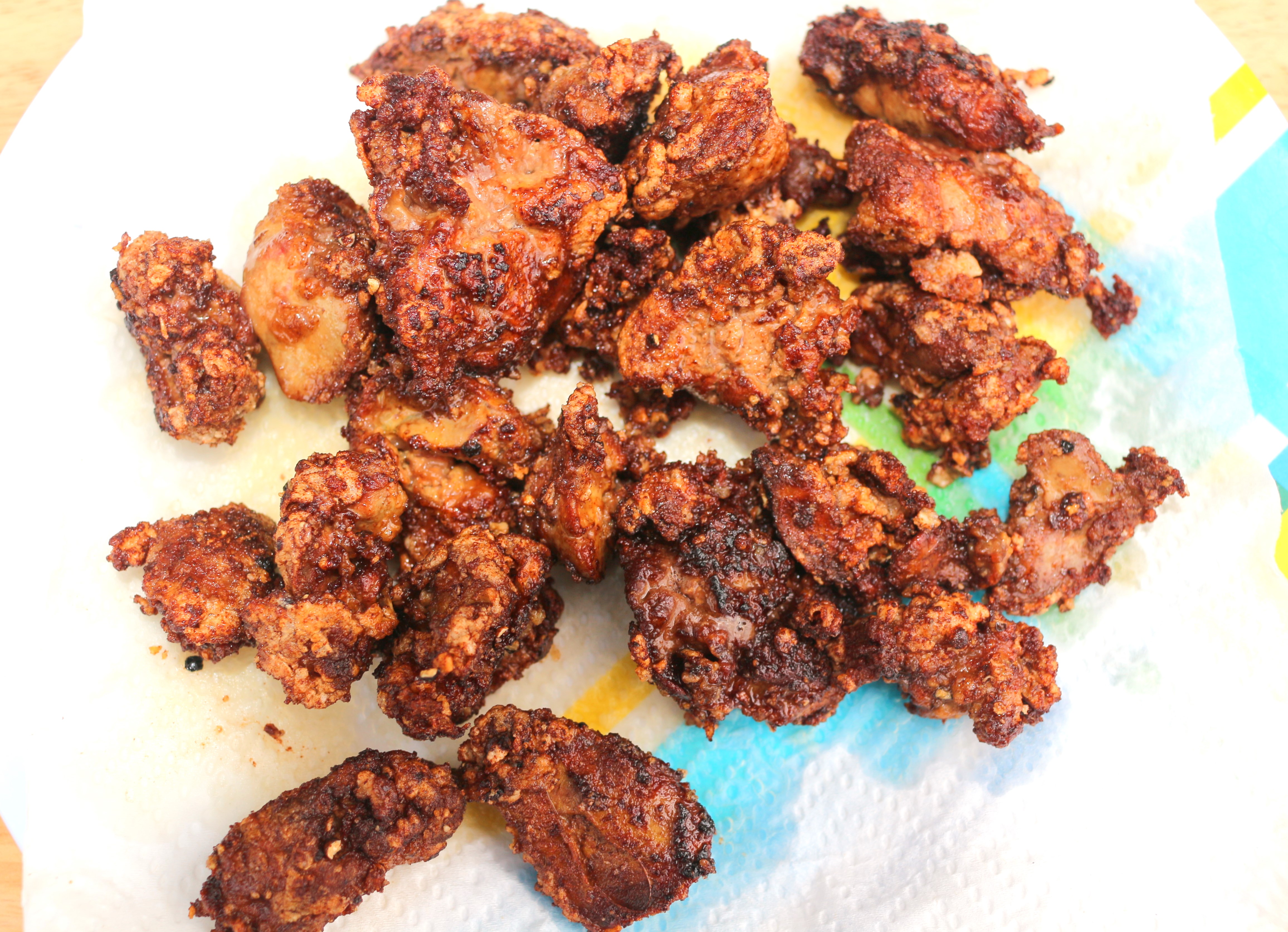 Salad Of Cracked Pepper-Dusted Chicken Liver Nuggets, Shredded Parmigiano Reggiano, Romaine, Mild Chillies And Red Onions ← Previous Next → remove to absorbent paper, add to the salad, sprinkle with fresh herbs of your choice, serve at once