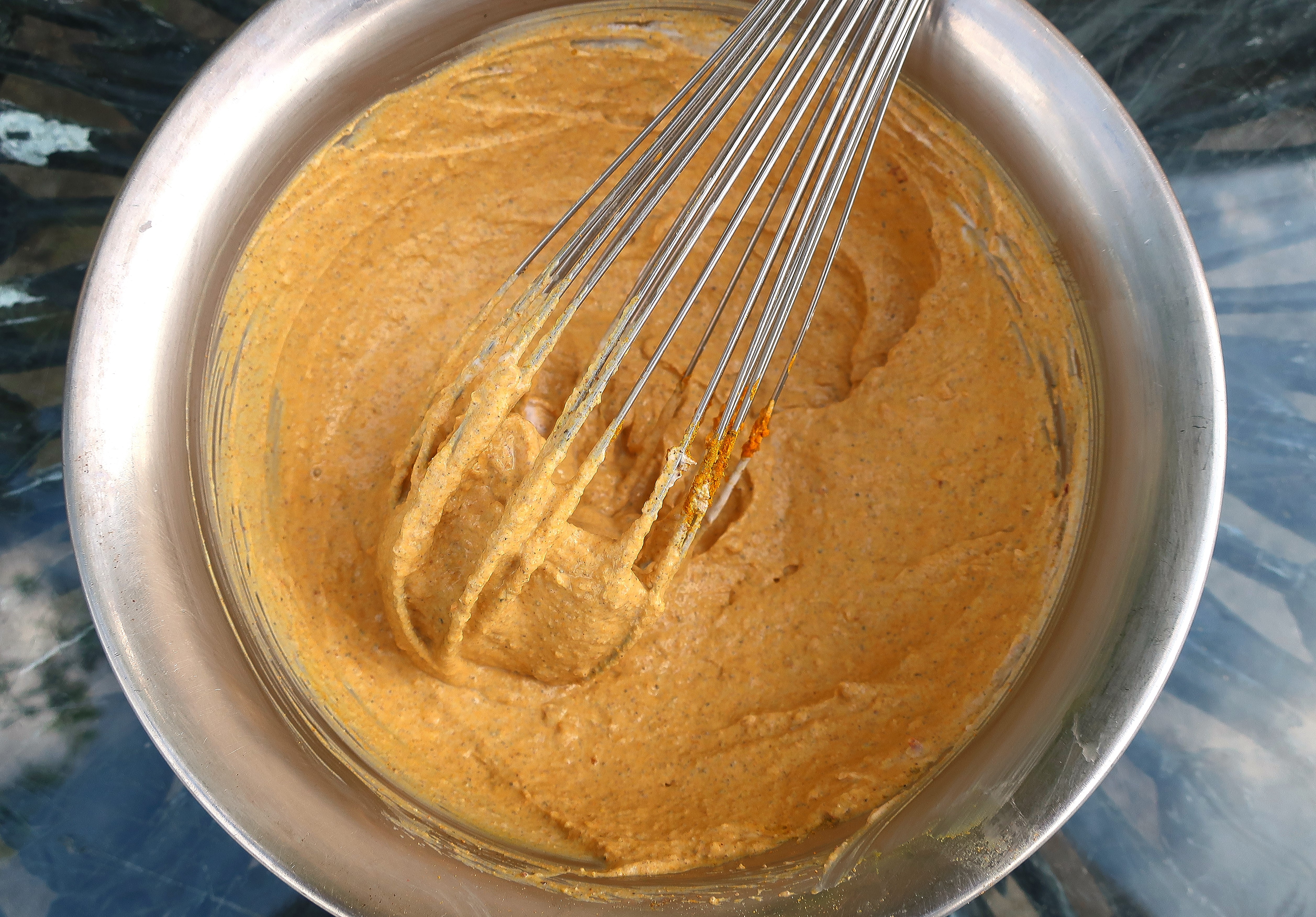 Simmer 6 lbs of pork ribs until tender, about 2 hours, shock in ice water, drain; mix 2 cup Greek yoghurt with 1/4 cup Rajah Tandoori Masala (buy at Indian market), 1 tblsp lemon juice, 1 tblsp onion powder, 1 tblsp galic powder, 1 tblsp turmeric, 1/2 tsp ginger powder, kosher salt to taste