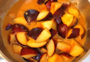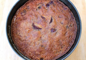 Of all fruit cakes my Mom used to bake, Plum cake was the one she baked most often. We owned some land with plum trees and apple trees on them, so these two fruits, and dishes made of them, (and liquor, “Apfel Schnaps” and “Zwetschken Geist”) were the most common in our home when I grew up. While as a kid I did not appreciate them as much, now I am a big fan, especially of plums. The one issue with fruit cakes I always have is that there is never enough fruit to the amount of cake. Here I solved the problem and even made the whole dish far better by adding plum compote to the cake, to be spooned over the cake while eating. Good Stuff !