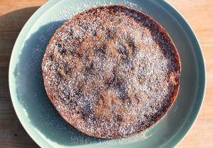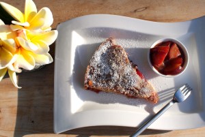 Of all fruit cakes my Mom used to bake, Plum cake was the one she baked most often. We owned some land with plum trees and apple trees on them, so these two fruits, and dishes made of them, (and liquor, “Apfel Schnaps” and “Zwetschken Geist”) were the most common in our home when I grew up. While as a kid I did not appreciate them as much, now I am a big fan, especially of plums. The one issue with fruit cakes I always have is that there is never enough fruit to the amount of cake. Here I solved the problem and even made the whole dish far better by adding plum compote to the cake, to be spooned over the cake while eating. Good Stuff !