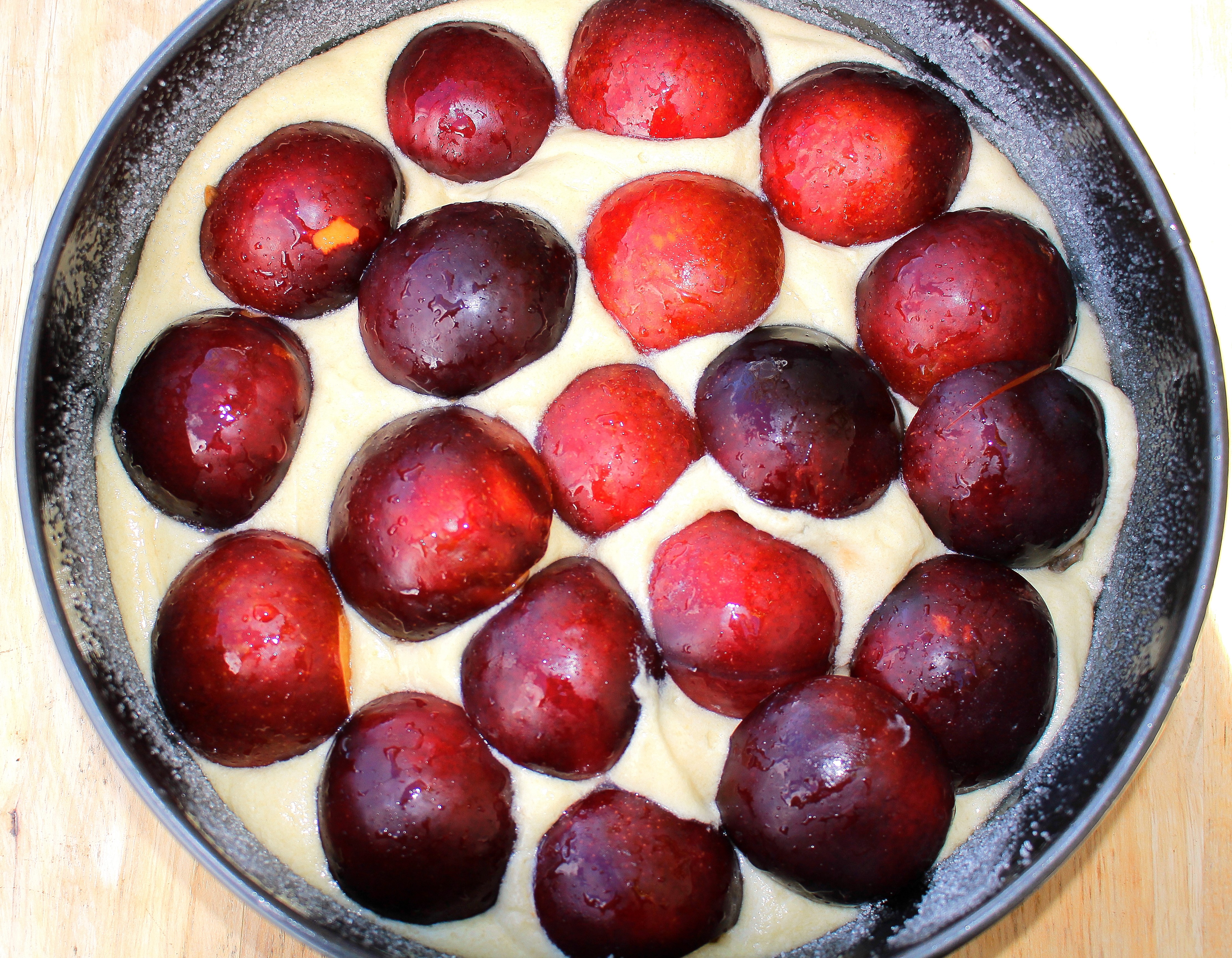 top the batter with the plums, skin side up, sprinkle lightly with sugar and ground cinnamon, drizzle with lemon juice, bake in a pre-heated 350F oven for one hour or until toothpick comes out clean from batter