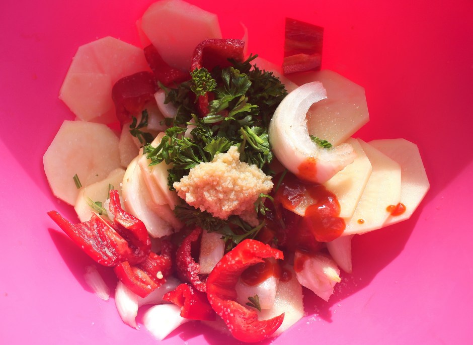 cut 2 ea large, peeled potatoes into slices, add 1 ea large coursely cut onion and 1 ea large, seeded, coursely cut red pepper, 2 tblsp chopped curley parsley, and 2 tblsp sliced scallions, season to taste with sriracha, kosher salt, garlic paste, oregano and tyyme, add a tblsp EVO, mix well