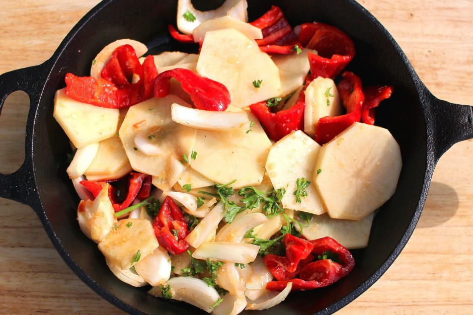 Chicken & Potatoes – Boss Level ← Previous Next → add the veggies to the bottom of a baking dish or cast iron pan,