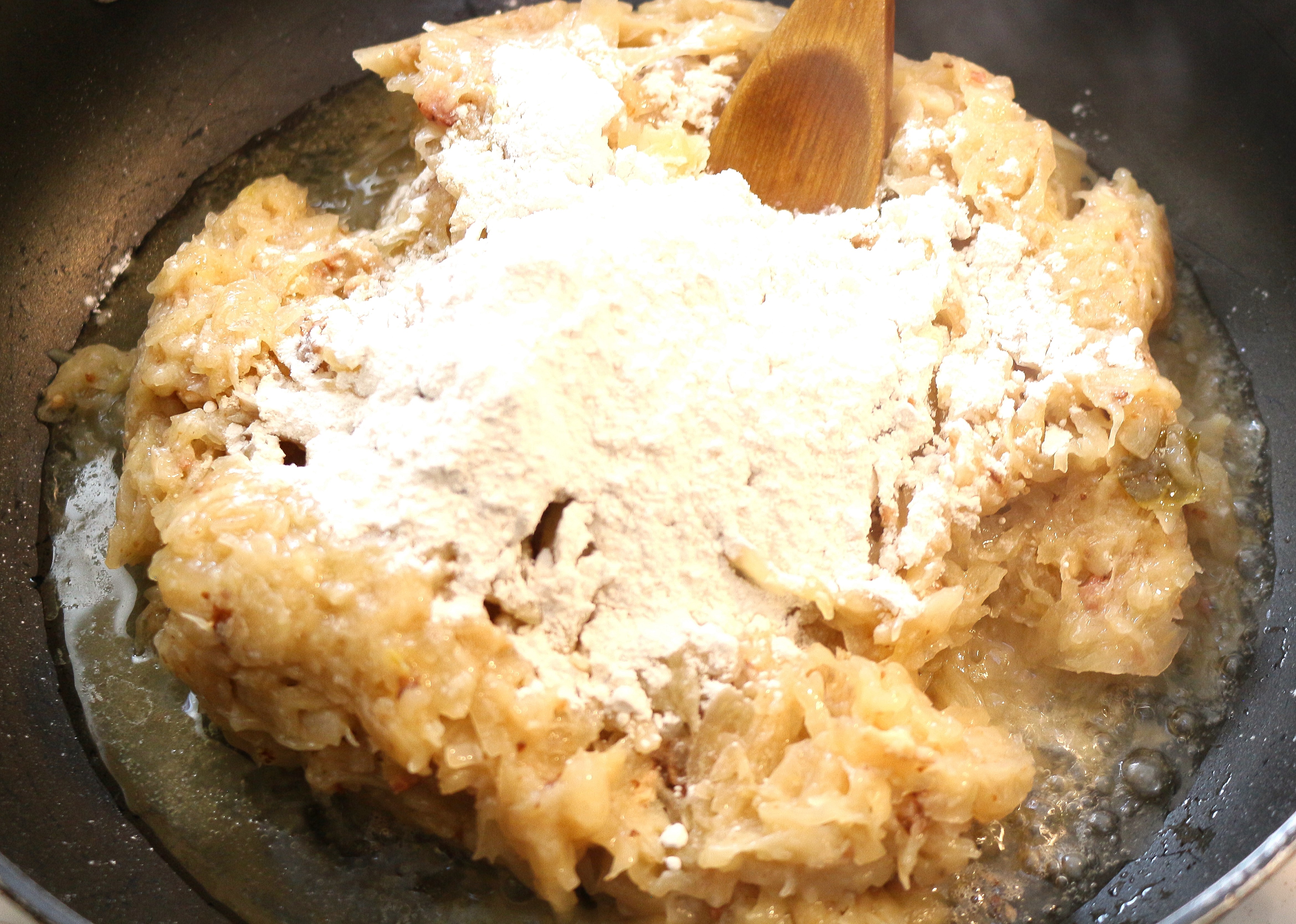 Sauerkraut Soup ← Previous Next → in 4 oz bacon fat saute 1 large sliced onion until translucent, add 20 oz drained, rinsed sauerkraut, add 1/2 cup a/p flour, saute 5 minutes more