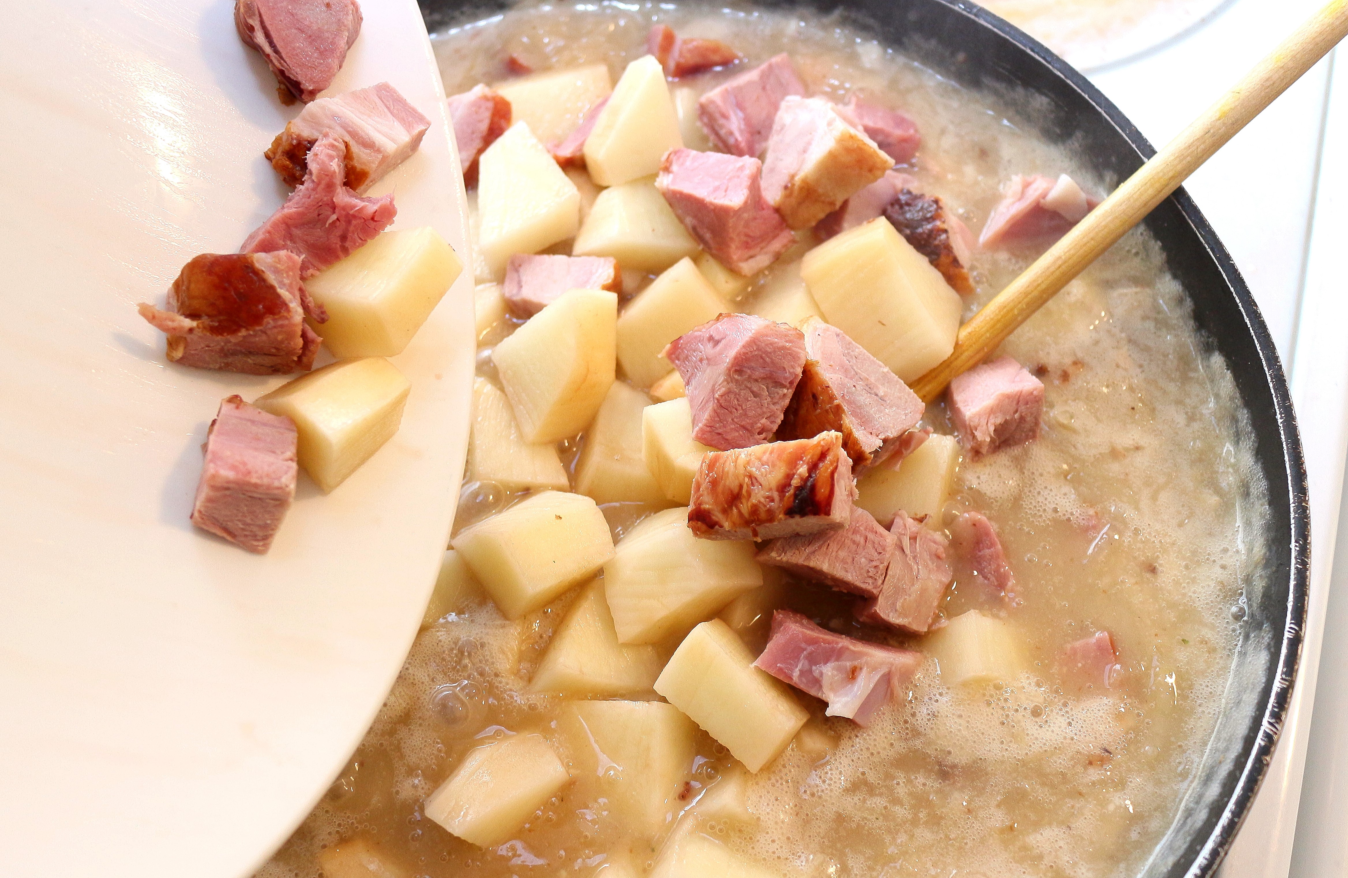 add the cooked ham hocks and the raw potatoes, season with kosher salt, cayenne pepper and a dash of maggi, bring to a simmer again, simmer for 20 minutes or until potatoes are soft but not mushy: if necessary, adjust texture of soup during this time