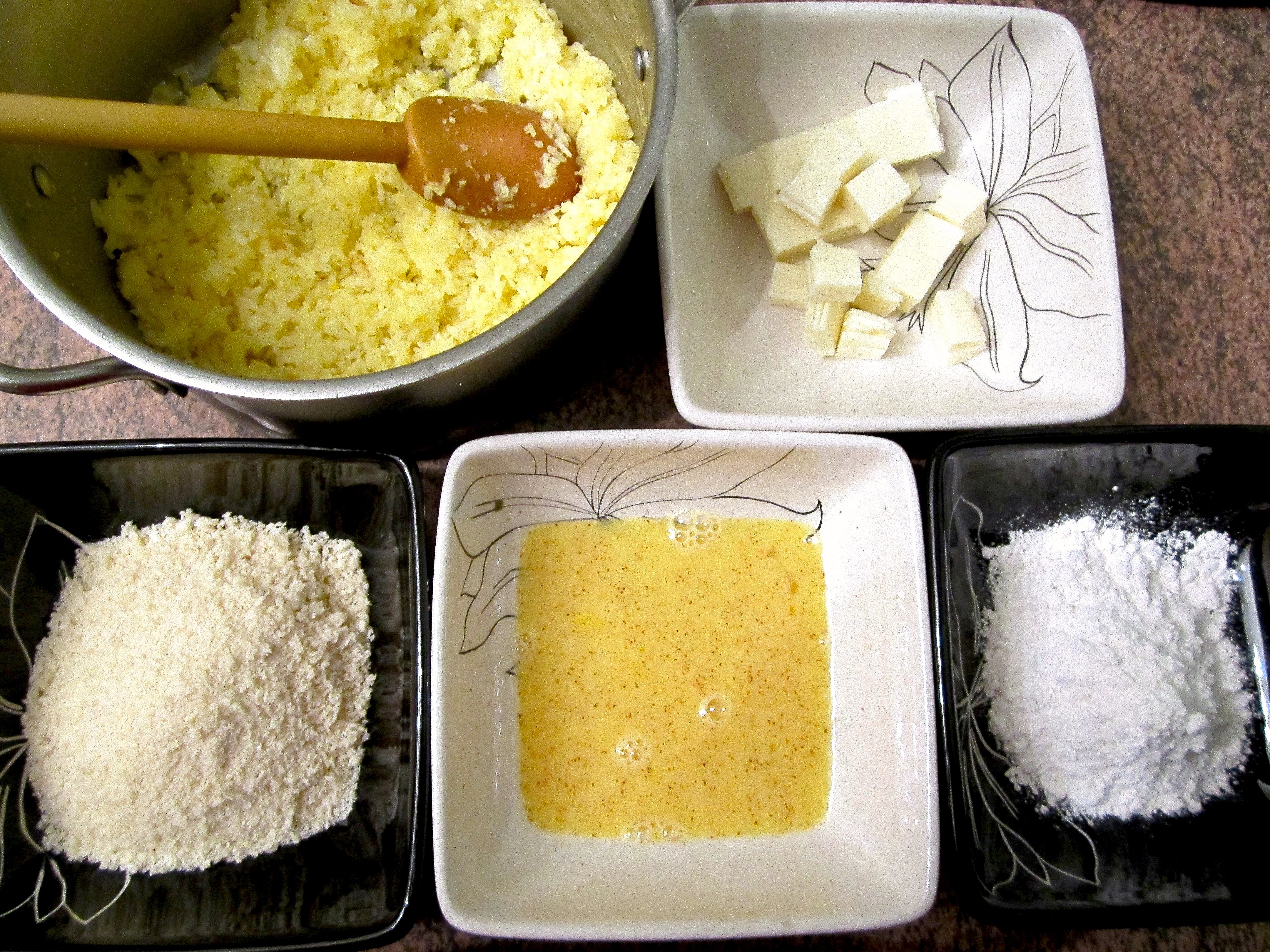 Suppli al Telefono ← Previous Next → form into 4-8 patties, press each into one hand, add a cube or piece of mozzarella, close the disk and roll between two hands to form even balls; bread in standard breading