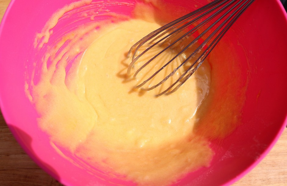 whisk 1.3 cups a/p flour, 1/2 tsp baking powder and a dash of salt in a bowl until combined., beat 1 stick butter and 3/4 cup sugar for a couple of minutes, beat in 2 large eggs and 1/2 tsp vanilla extract, add the flour mixture and 3/4 cup of milk, stir until smooth