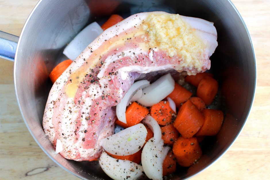 Pork Belly And Broccoli In Chili/Hoisin Sauce Next → simmer 2.5 lbs bone-in pork belly together with 2 large diced onions and 2 large diced carrots in water seasoned with kosher salt, garlic paste and fresh cracked black pepper until the belly is tender but not falling apart