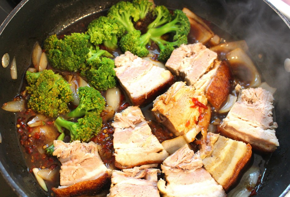 0aaaa (2) ← Previous Next → add the pork belly and 2 cups cooked broccoli florets, simmer 2 minutes while spooning the sauce over the meat and vegetable