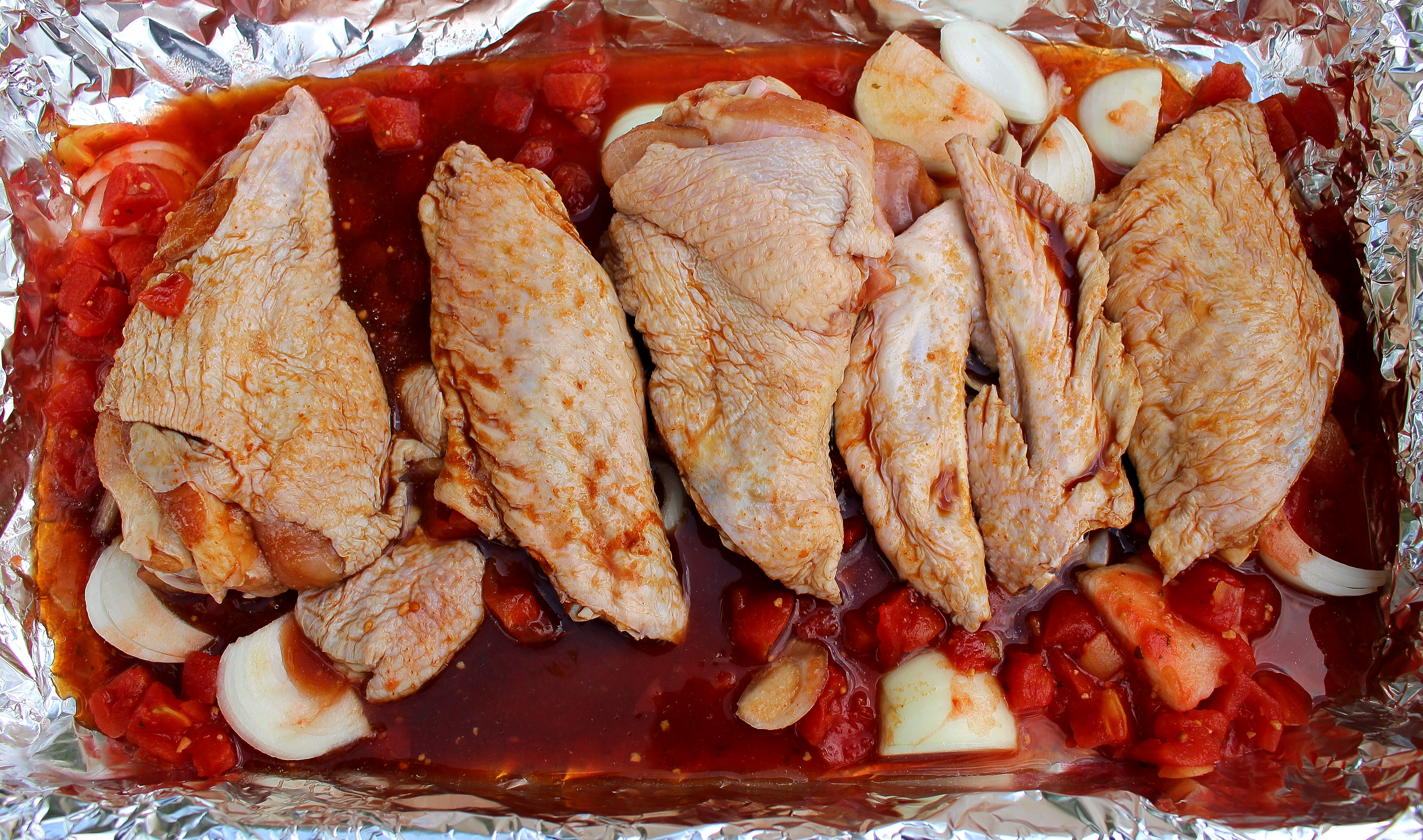 Turkey For Singles ← Previous Next → in a baking pan mix 3 cups of white wine, 6 cups of chicken stock, 2 cup concasse and 2 medium size julienned onions, add the wings skin side down, braise in a 420 F oven 1 – 1,5 hours