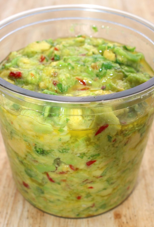 remove the flesh from 2 ea large choquette avocados (or equal quantity of avocado of your choice), add 1/2 cup EVO, 1/4 cup fresh lime or lemon juice, 1 tblsp chili paste, 1 tsp garlic paste and kosher salt to taste