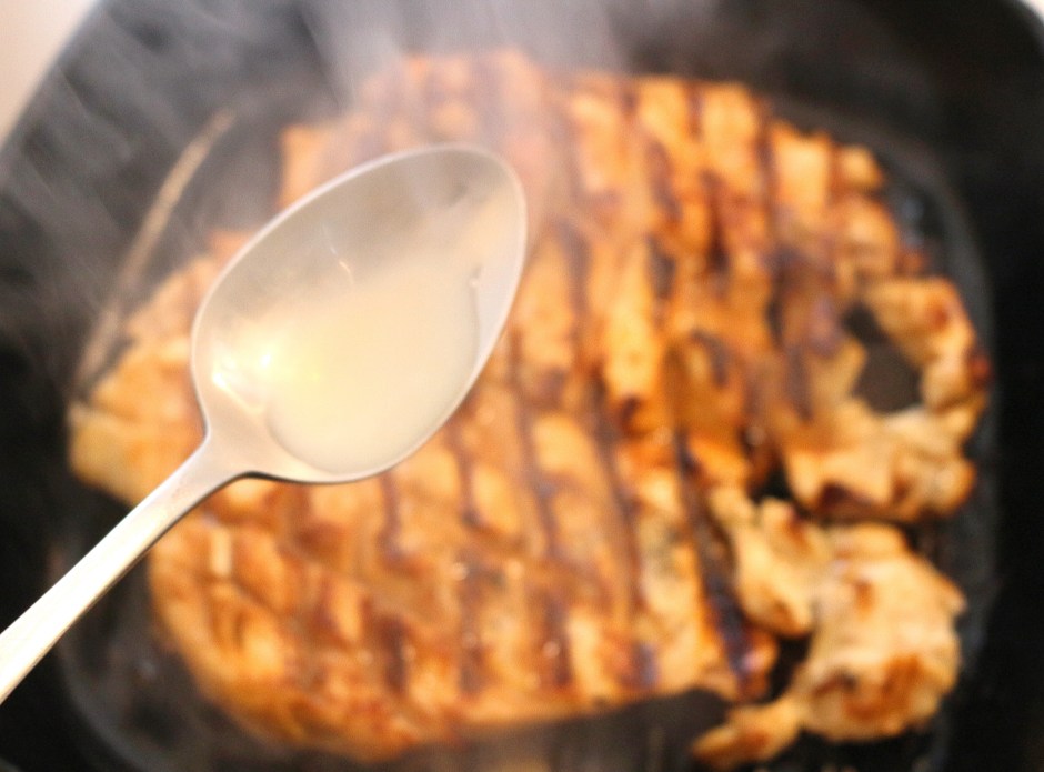 drizzle with 1/2 tblsp lemon juice, turn chicken, repeat on the other side, cook until chicken is medium well, remove from grill, let rest in a warm place for 3-4 minutes to let the carry-over heat finish the cooking process and redistribute the juices; to serve, top with the onions and serve with salad of your choice