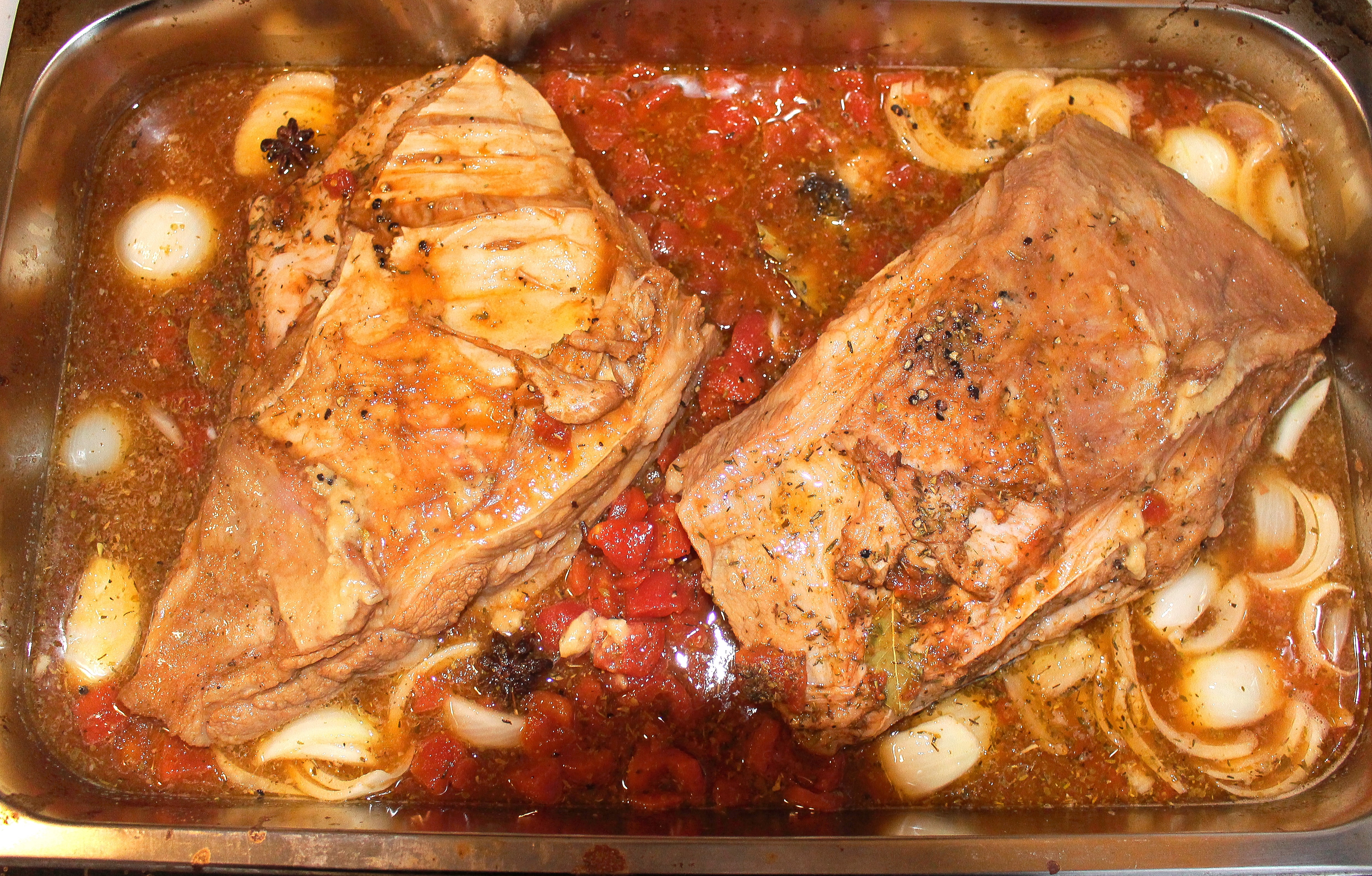 next day, discard the brine; to a roasting pan add 4 medium size onions, cut into coarse julienne, add 1 qt good quality red wine, 2 lb diced tomatoes, 6 ea smashed garlic cloves, 4 ea laurel leaves, 1 tblsp dried oregano, 1 tblsp dried thyme, 1 cup soy sauce, 2 qt chicken or beef stock, 1/2 tblsp kosher salt, 15 ea crushed black pepper corns; braise in a 300F oven for 3,5 to 4.5 hours, depending on the thickness and toughness of the meat