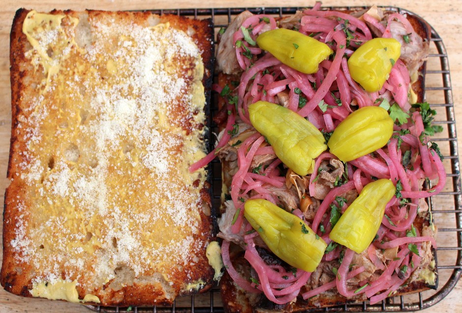 Toasted Focaccia Sandwich With Veal & Pickled Onions ← Previous Next → add a generous amount of pickled onions, chopped cilantro and pickled peppers/chilies of your choice