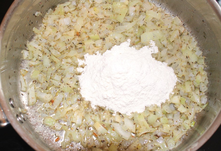 add 1/3 cup a/p flour and 1 tblsp thyme, saute until “blond”