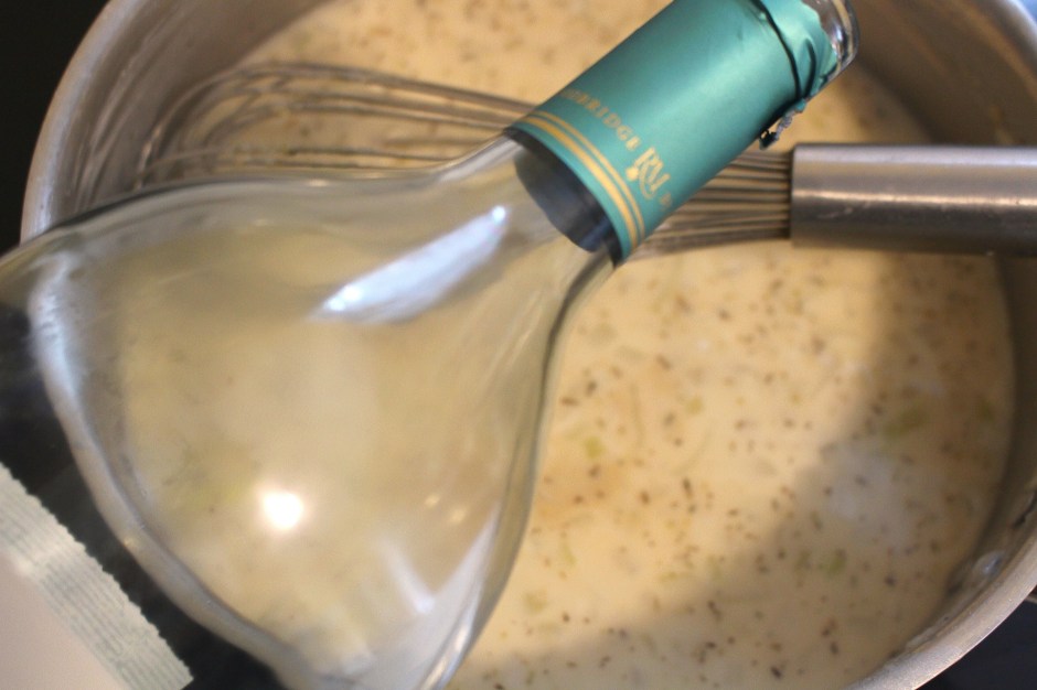 Clam Chowder ← Previous Next → add 2 cup pinot grigio, whisk until the soup comes to a simmer, simmer for 5 minutes