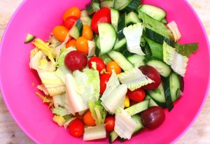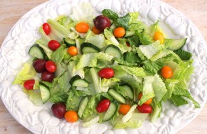 Mix romaine lettuce, cucumbers and rainbow grape tomatoes with a simple honey/mustard vinaigrette, plate on serving platter.