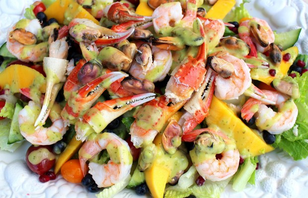 “Romaine Lettuce With Shrimp, Mussels, Crab Claws, And Fruits, Dressed In Avocado Salsa”