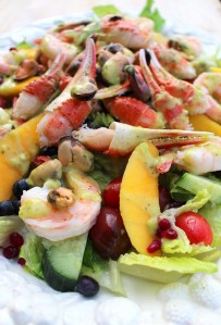 - Romaine Lettuce With Shrimp, Mussels, Crab Claws, And Fruits, Dressed In Avocado Salsa