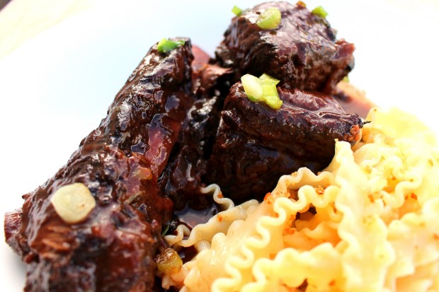 Beef Ribs Braised With Blueberries And Merlot, Served With Mafaldine & Pangrattato