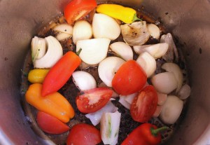 - in the remaining fat, saute 2 ea cut onion, 2 ea cut tomatoes, 5 ea med hot chilies and 5 ea cloves of garlic until the onions are caramelized